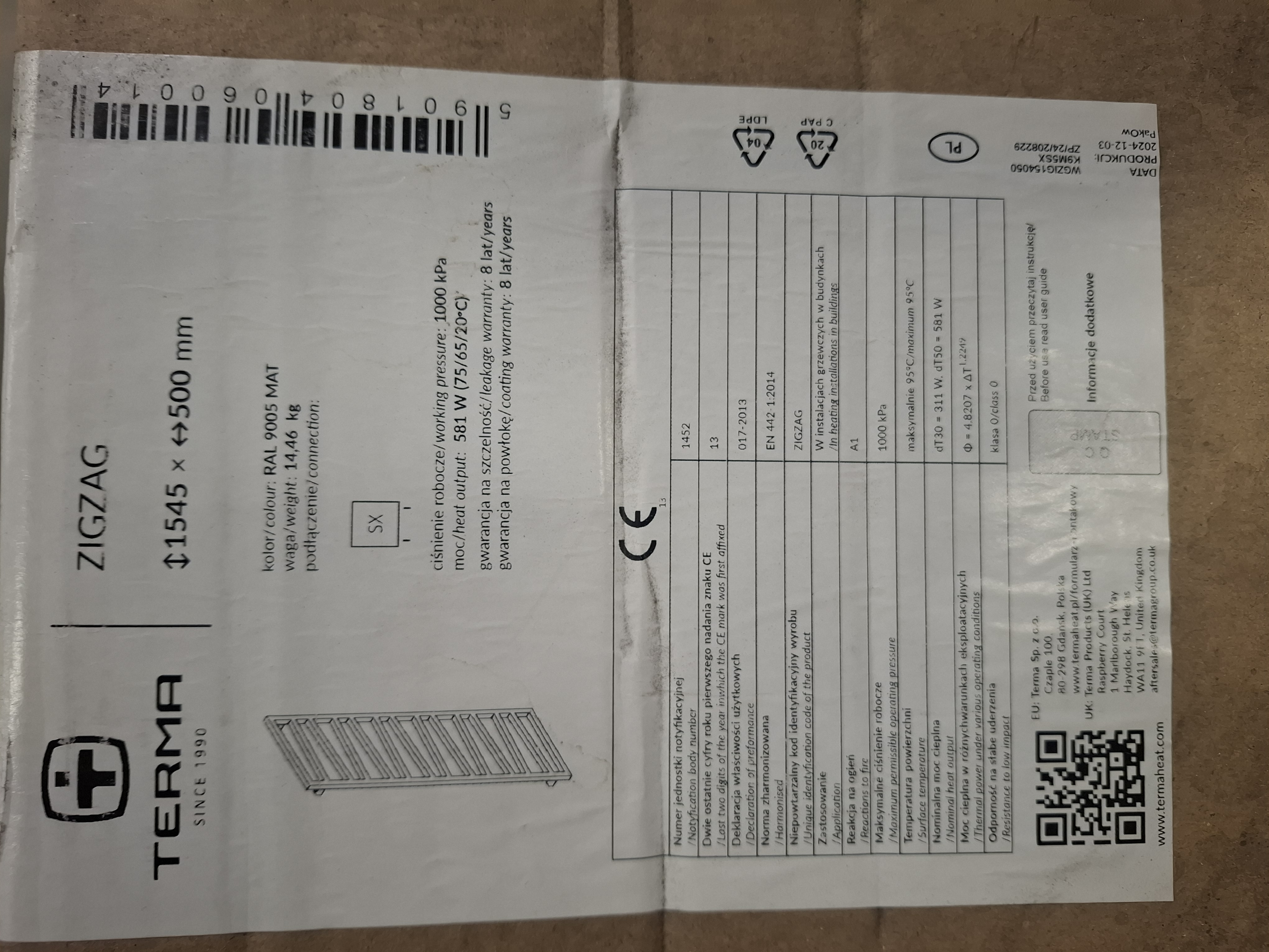 Pyyhekuivain Design Terma Zigzag Mattamusta 1545x500mm
