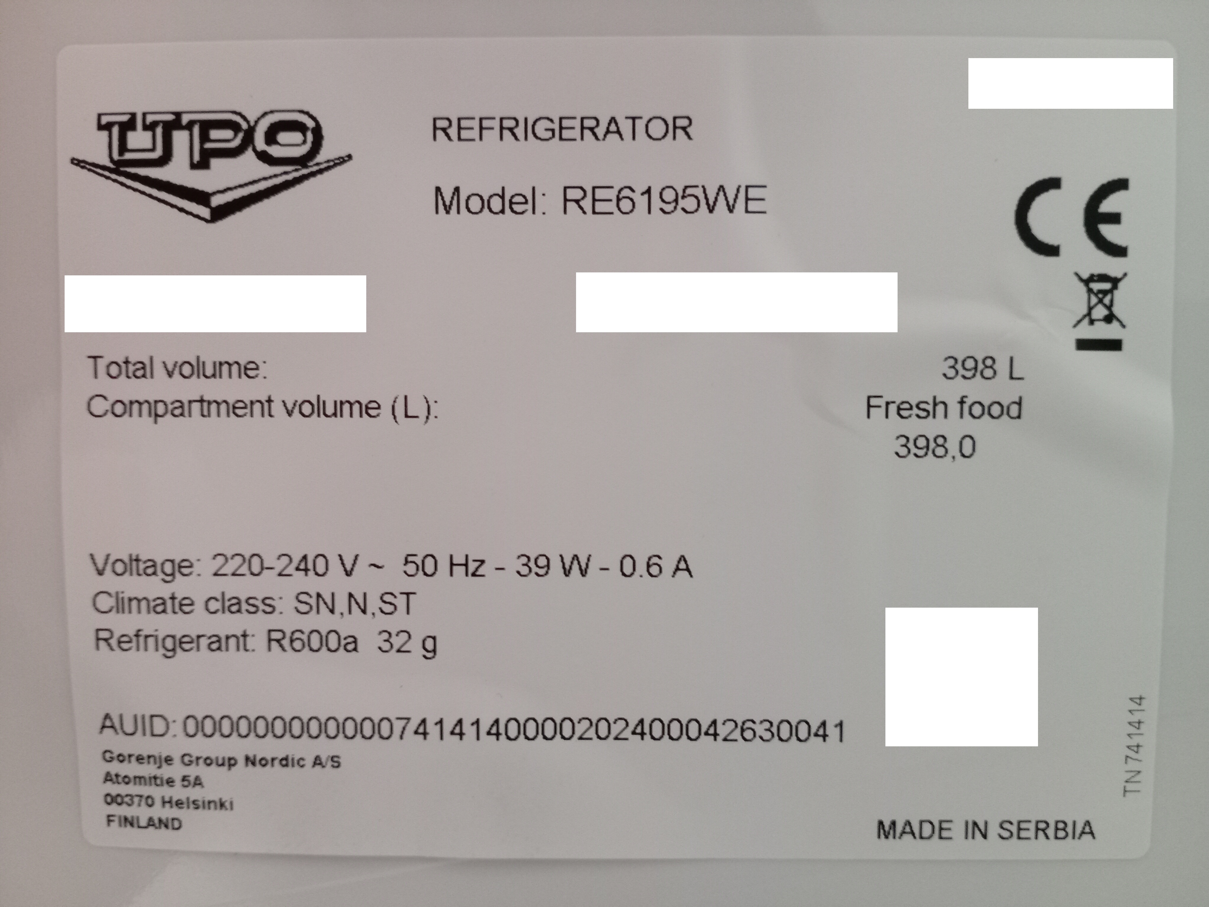 UPO RE6195WE jääkaappi, 398L